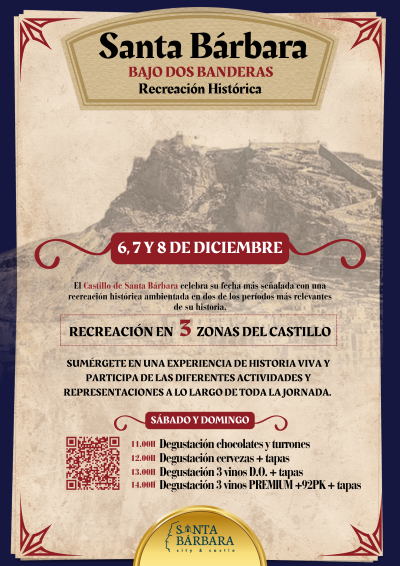 Alicante, 3 de diciembre de 2025. El castillo de Santa Bárbara se prepara para celebrar un nuevo fin de semana de recreación histórica bajo el título “Santa Bárbara bajo dos Banderas” que se celebrará coincidiendo con el puente festivo el sábado 6, domingo 7 y lunes 8 de diciembre. La fortaleza vuelve al pasado para celebrar el día de Santa Bárbara, el 4 de diciembre, aniversario de la reconquista del Castillo en 1248, por el que recibió su nombre.