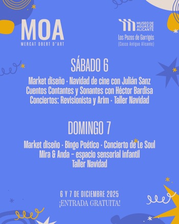 The Mercat Obert d’Art (MOA) returns this Christmas with an expanded format and a programme brimming with creativity at every turn: art, design, concerts, workshops and activities for all the family at the Pozos de Garrigós – Alicante Water Museum and Plaza del Puente, right in the heart of the old town.
