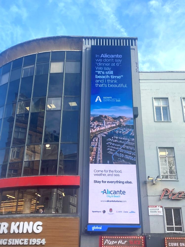 La campaña promocional de Alicante en Londres consiste en la aparición de frases de “Spain Says” en una gran pantalla doble en Leicester Square similar a la lona instalada recientemente en la Puerta del Sol de Madrid.